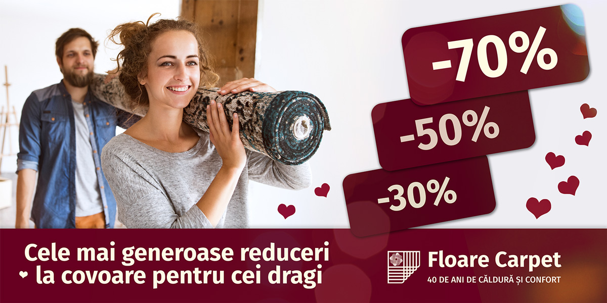 Vino în perioada 14 februarie - 11 martie 2019 în magazinul de fabrică Floare-Carpet și beneficiază de cele mai generoase reduceri -30% -50% -70%