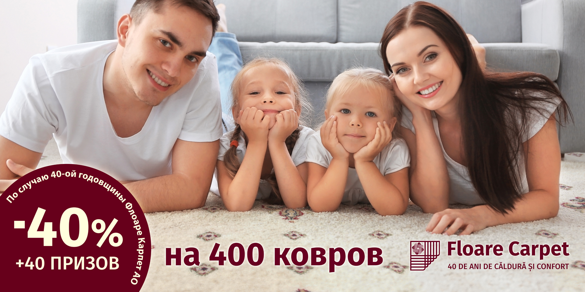 Предлагаем 400 ковров со специальной скидкой в 40%, к 40-тию Флоаре Карпет АО и гарантированные 15% скидки на все ковры. Наша фабрика желает отпраздновать юбилей вместе с Вами: те, кто уже оценил качество, тепло и комфорт наших ковров!